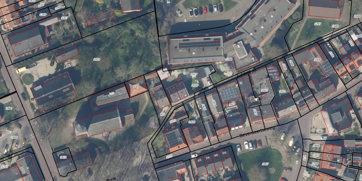 Het perceel waarop Brink 13 staat heeft een oppervlakte van 447 m². Dit is een groot perceel. De perceeloppervlakte wordt geregistreerd door het Kadaster. Gedetailleerde informatie over de maten van dit perceel kunt u vinden in het rapport Kadastrale kaart met maatvoering van Brink 13.