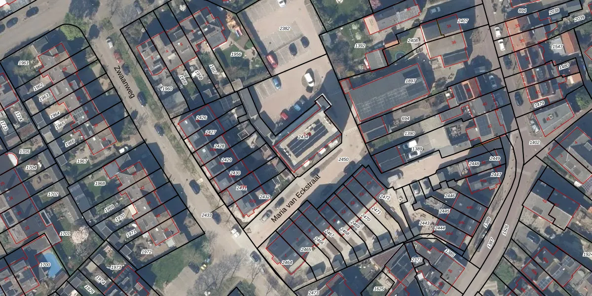 Maria van Eckstraat 14 is gelegen op kadastraal perceel WHV00A2434. Deze kadastrale aanduiding is uniek en wordt gebruikt door het Kadaster om eigendomsrechten en andere zakelijke rechten vast te leggen. Het perceel maakt onderdeel uit van de kadastrale gemeente Werkhoven.