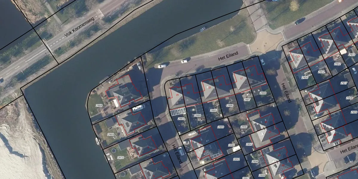 Het Eiland 25 is gelegen op kadastraal perceel WVH00D2883. Deze kadastrale aanduiding is uniek en wordt gebruikt door het Kadaster om eigendomsrechten en andere zakelijke rechten vast te leggen. Het perceel maakt onderdeel uit van de kadastrale gemeente Wervershoof.