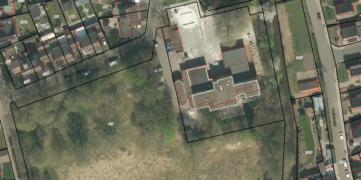 Het Schoor 1-b is gelegen op kadastraal perceel WSM01D965. Deze kadastrale aanduiding is uniek en wordt gebruikt door het Kadaster om eigendomsrechten en andere zakelijke rechten vast te leggen. Het perceel maakt onderdeel uit van de kadastrale gemeente Wessem.
