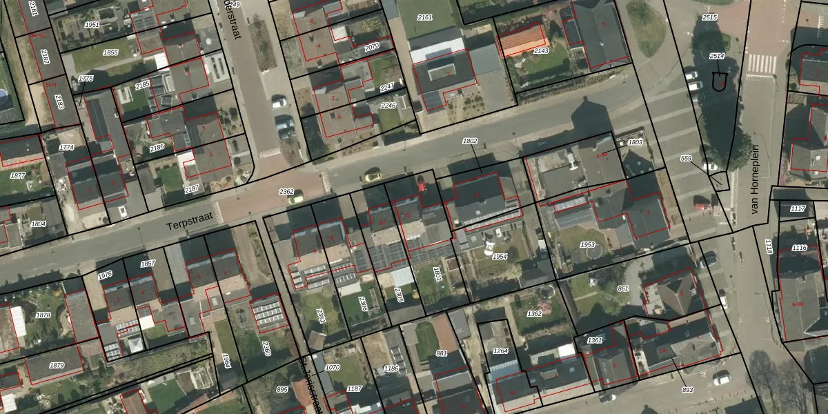 Terpstraat 12 is gelegen op kadastraal perceel WSM01A1801. Deze kadastrale aanduiding is uniek en wordt gebruikt door het Kadaster om eigendomsrechten en andere zakelijke rechten vast te leggen. Het perceel maakt onderdeel uit van de kadastrale gemeente Wessem.