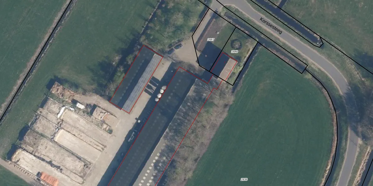 Het perceel waarop Korssesteeg 1 staat heeft een oppervlakte van 11,8 ha. Dit is een zeer groot perceel. De perceeloppervlakte wordt geregistreerd door het Kadaster. Gedetailleerde informatie over de maten van dit perceel kunt u vinden in het rapport Kadastrale kaart met maatvoering van Korssesteeg 1.