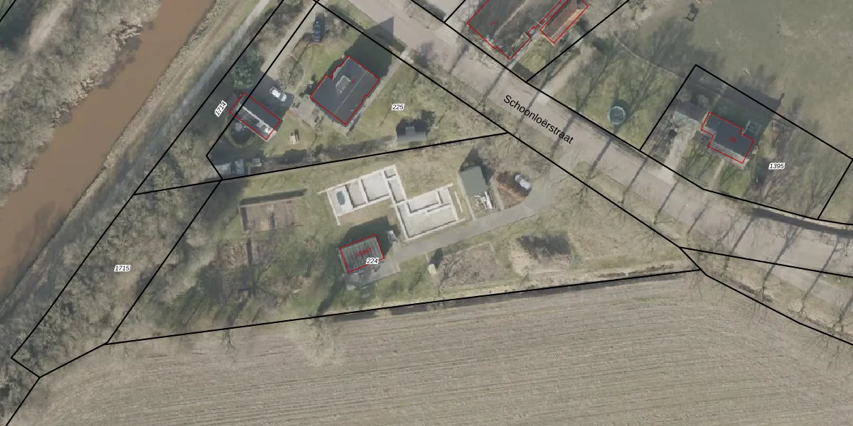 Het perceel waarop Schoonloërstraat 1 staat heeft een oppervlakte van 3830 m². Dit is een zeer groot perceel. De perceeloppervlakte wordt geregistreerd door het Kadaster. Gedetailleerde informatie over de maten van dit perceel kunt u vinden in het rapport Kadastrale kaart met maatvoering van Schoonloërstraat 1.