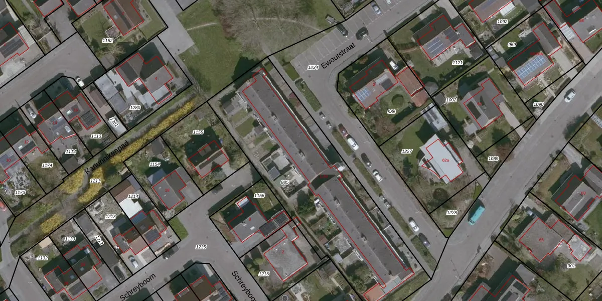 Het perceel waarop Ewoutstraat 13 staat heeft een oppervlakte van 2260 m². Dit is een zeer groot perceel. De perceeloppervlakte wordt geregistreerd door het Kadaster. Gedetailleerde informatie over de maten van dit perceel kunt u vinden in het rapport Kadastrale kaart met maatvoering van Ewoutstraat 13.