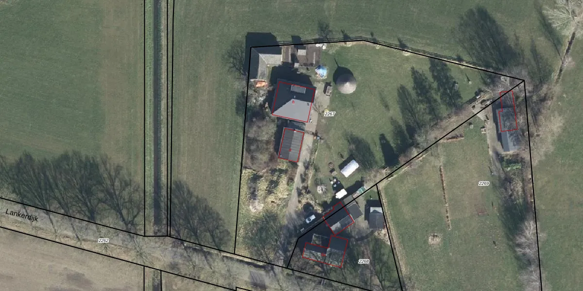 Het perceel waarop Lankerdijk 8 staat heeft een oppervlakte van 4185 m². Dit is een zeer groot perceel. De perceeloppervlakte wordt geregistreerd door het Kadaster. Gedetailleerde informatie over de maten van dit perceel kunt u vinden in het rapport Kadastrale kaart met maatvoering van Lankerdijk 8.