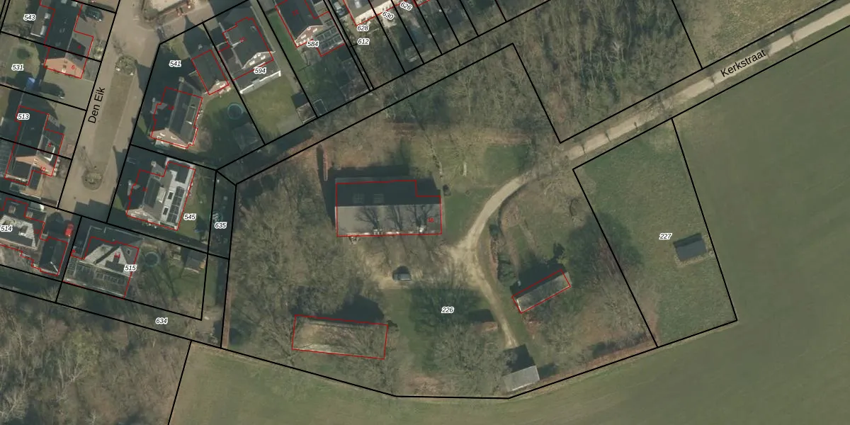 Het perceel waarop Kerkstraat 48 staat heeft een oppervlakte van 6440 m². Dit is een zeer groot perceel. De perceeloppervlakte wordt geregistreerd door het Kadaster. Gedetailleerde informatie over de maten van dit perceel kunt u vinden in het rapport Kadastrale kaart met maatvoering van Kerkstraat 48.