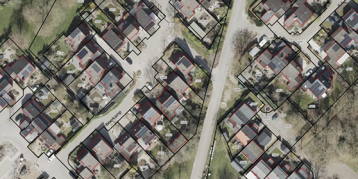 Het perceel waarop Boerkamp 31 staat heeft een oppervlakte van 362 m². Dit is een groot perceel. De perceeloppervlakte wordt geregistreerd door het Kadaster. Gedetailleerde informatie over de maten van dit perceel kunt u vinden in het rapport Kadastrale kaart met maatvoering van Boerkamp 31.