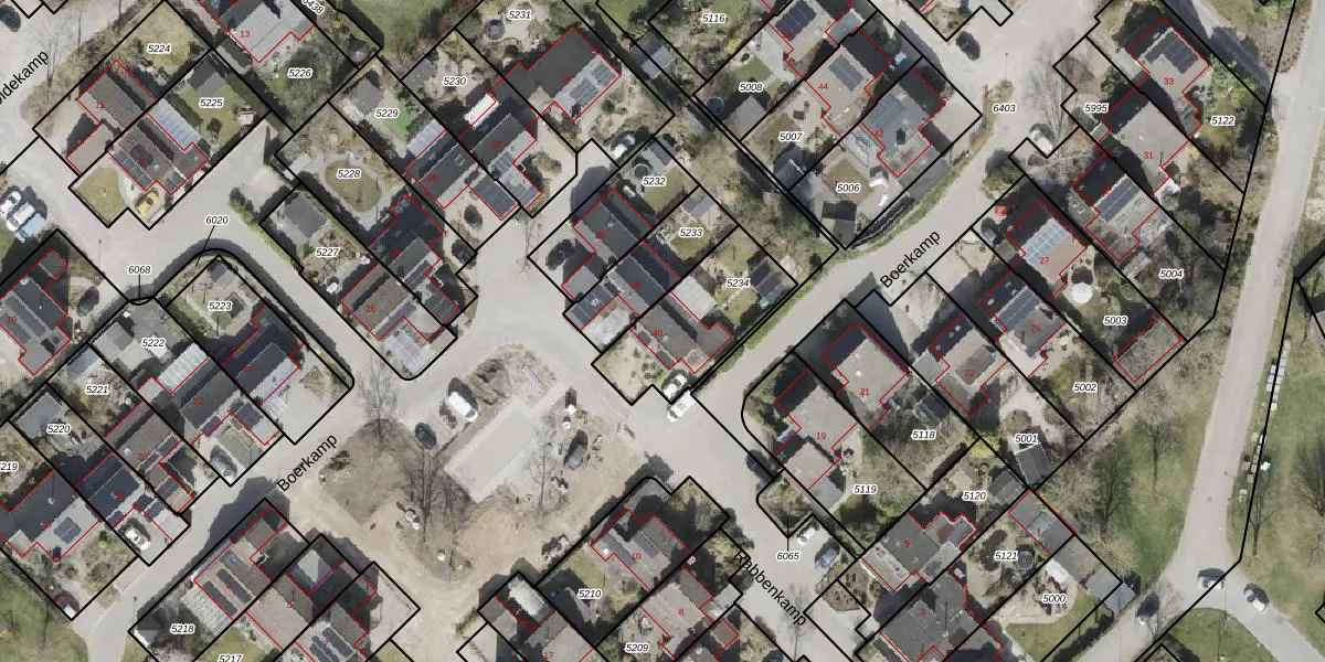 Het perceel waarop Boerkamp 40 staat heeft een oppervlakte van 373 m². Dit is een groot perceel. De perceeloppervlakte wordt geregistreerd door het Kadaster. Gedetailleerde informatie over de maten van dit perceel kunt u vinden in het rapport Kadastrale kaart met maatvoering van Boerkamp 40.