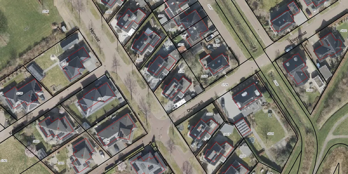 Het perceel waarop Homaat 12 staat heeft een oppervlakte van 485 m². Dit is een groot perceel. De perceeloppervlakte wordt geregistreerd door het Kadaster. Gedetailleerde informatie over de maten van dit perceel kunt u vinden in het rapport Kadastrale kaart met maatvoering van Homaat 12.
