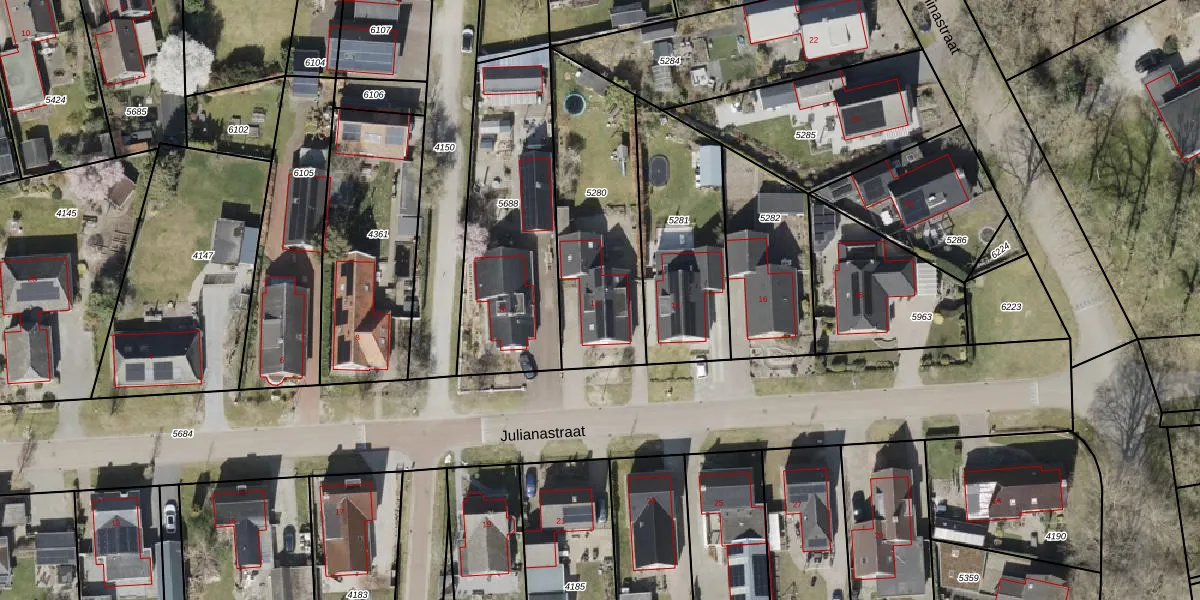Het perceel waarop Julianastraat 12 staat heeft een oppervlakte van 696 m². Dit is een groot perceel. De perceeloppervlakte wordt geregistreerd door het Kadaster. Gedetailleerde informatie over de maten van dit perceel kunt u vinden in het rapport Kadastrale kaart met maatvoering van Julianastraat 12.