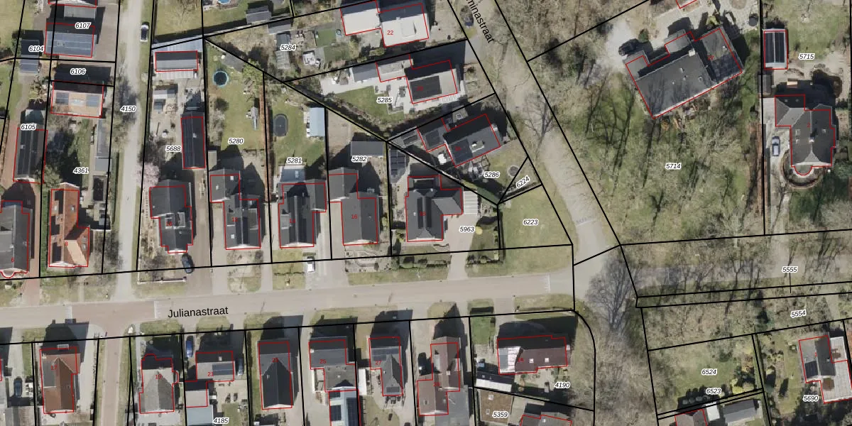 Het perceel waarop Julianastraat 18 staat heeft een oppervlakte van 476 m². Dit is een groot perceel. De perceeloppervlakte wordt geregistreerd door het Kadaster. Gedetailleerde informatie over de maten van dit perceel kunt u vinden in het rapport Kadastrale kaart met maatvoering van Julianastraat 18.