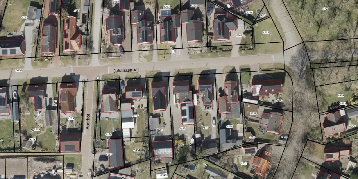 Het perceel waarop Julianastraat 25 staat heeft een oppervlakte van 615 m². Dit is een groot perceel. De perceeloppervlakte wordt geregistreerd door het Kadaster. Gedetailleerde informatie over de maten van dit perceel kunt u vinden in het rapport Kadastrale kaart met maatvoering van Julianastraat 25.