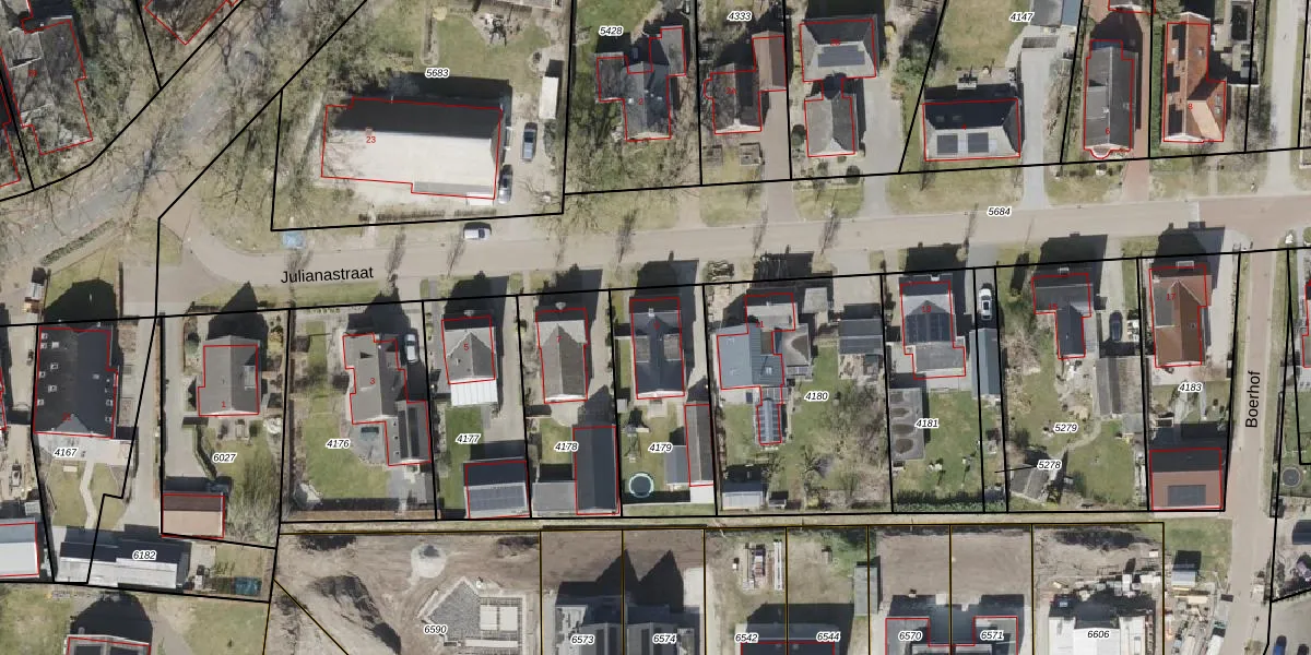 Het perceel waarop Julianastraat 9 staat heeft een oppervlakte van 500 m². Dit is een groot perceel. De perceeloppervlakte wordt geregistreerd door het Kadaster. Gedetailleerde informatie over de maten van dit perceel kunt u vinden in het rapport Kadastrale kaart met maatvoering van Julianastraat 9.