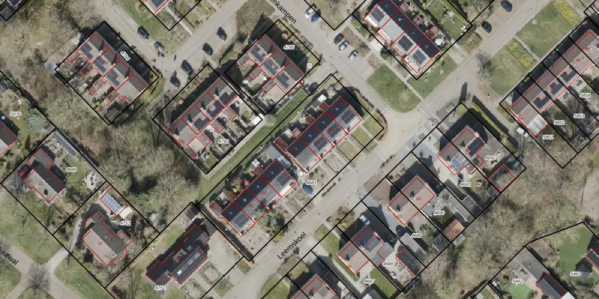 Het perceel waarop Leemskoel 49 staat heeft een oppervlakte van 1617 m². Dit is een zeer groot perceel. De perceeloppervlakte wordt geregistreerd door het Kadaster. Gedetailleerde informatie over de maten van dit perceel kunt u vinden in het rapport Kadastrale kaart met maatvoering van Leemskoel 49.