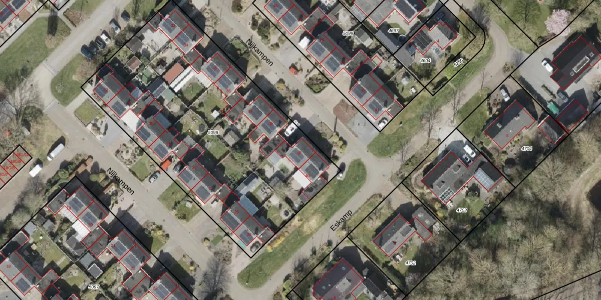 Het perceel waarop Nijkampen 39 staat heeft een oppervlakte van 3353 m². Dit is een zeer groot perceel. De perceeloppervlakte wordt geregistreerd door het Kadaster. Gedetailleerde informatie over de maten van dit perceel kunt u vinden in het rapport Kadastrale kaart met maatvoering van Nijkampen 39.