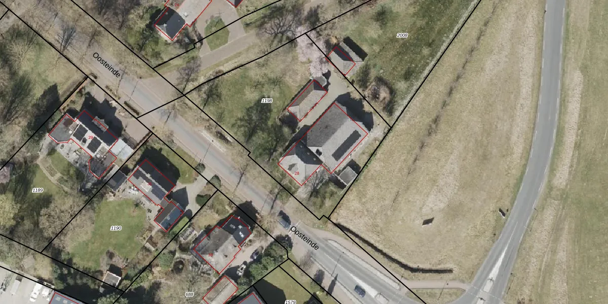 Het perceel waarop Oosteinde 28 staat heeft een oppervlakte van 2105 m². Dit is een zeer groot perceel. De perceeloppervlakte wordt geregistreerd door het Kadaster. Gedetailleerde informatie over de maten van dit perceel kunt u vinden in het rapport Kadastrale kaart met maatvoering van Oosteinde 28.