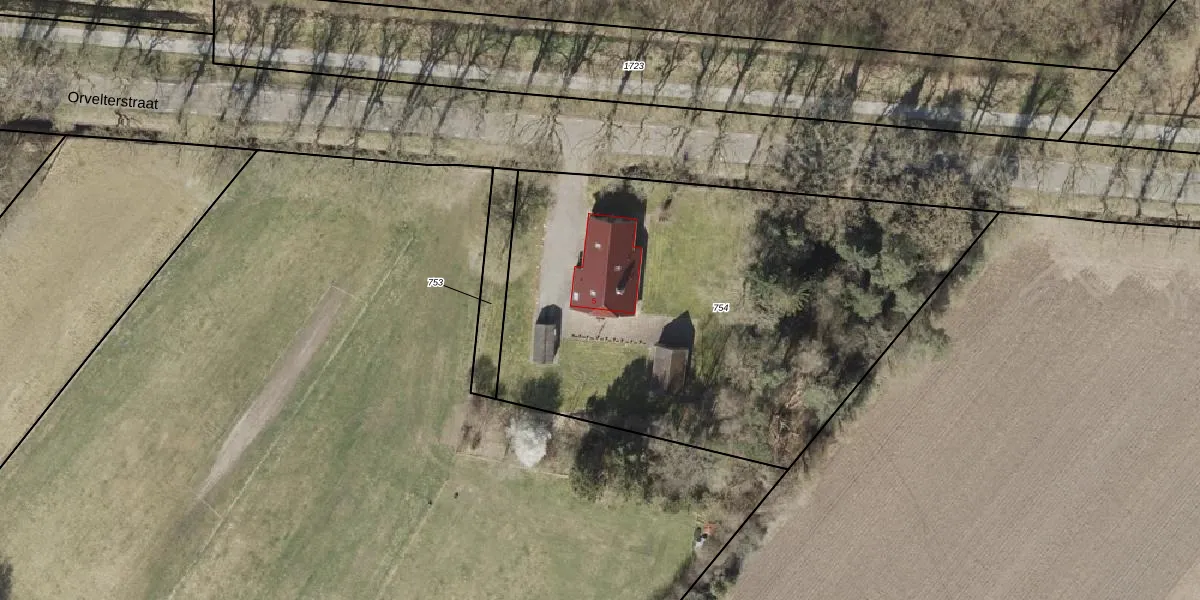 Het perceel waarop Orvelterstraat 5 staat heeft een oppervlakte van 2800 m². Dit is een zeer groot perceel. De perceeloppervlakte wordt geregistreerd door het Kadaster. Gedetailleerde informatie over de maten van dit perceel kunt u vinden in het rapport Kadastrale kaart met maatvoering van Orvelterstraat 5.
