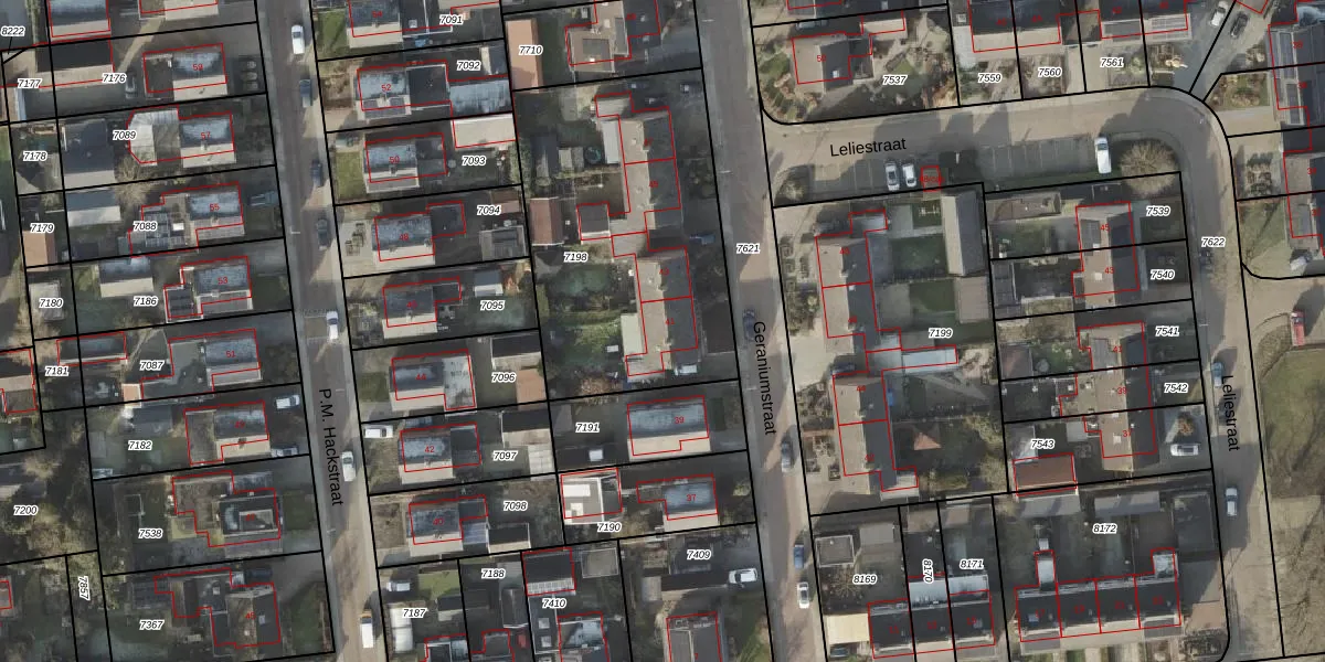 Het perceel waarop Geraniumstraat 41 staat heeft een oppervlakte van 1375 m². Dit is een zeer groot perceel. De perceeloppervlakte wordt geregistreerd door het Kadaster. Gedetailleerde informatie over de maten van dit perceel kunt u vinden in het rapport Kadastrale kaart met maatvoering van Geraniumstraat 41.