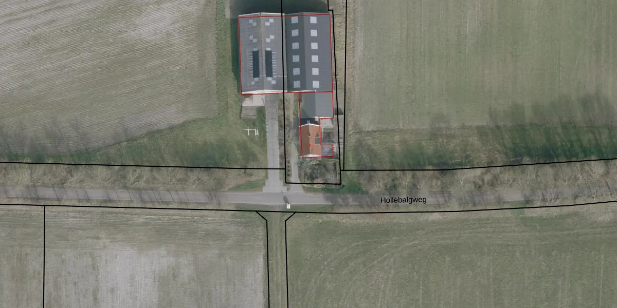 Het perceel waarop Hollebalgweg 8 staat heeft een oppervlakte van 2162 m². Dit is een zeer groot perceel. De perceeloppervlakte wordt geregistreerd door het Kadaster. Gedetailleerde informatie over de maten van dit perceel kunt u vinden in het rapport Kadastrale kaart met maatvoering van Hollebalgweg 8.