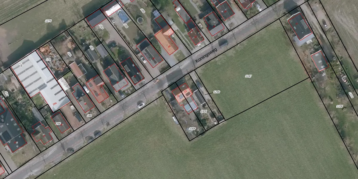 Het perceel waarop Koningsweg 21 staat heeft een oppervlakte van 323 m². Dit is een groot perceel. De perceeloppervlakte wordt geregistreerd door het Kadaster. Gedetailleerde informatie over de maten van dit perceel kunt u vinden in het rapport Kadastrale kaart met maatvoering van Koningsweg 21.