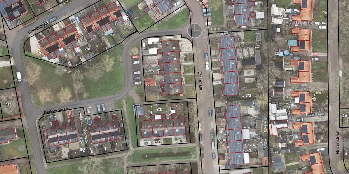 Essenlaan 30 is gelegen op kadastraal perceel SDA00K381. Deze kadastrale aanduiding is uniek en wordt gebruikt door het Kadaster om eigendomsrechten en andere zakelijke rechten vast te leggen. Het perceel maakt onderdeel uit van de kadastrale gemeente Scheemda.