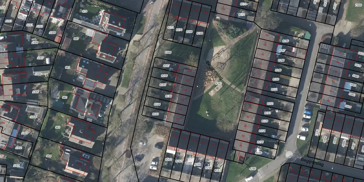 Het perceel waarop Begijneslag 108 staat heeft een oppervlakte van 131 m². Dit is een middelgroot perceel. De perceeloppervlakte wordt geregistreerd door het Kadaster. Gedetailleerde informatie over de maten van dit perceel kunt u vinden in het rapport Kadastrale kaart met maatvoering van Begijneslag 108.
