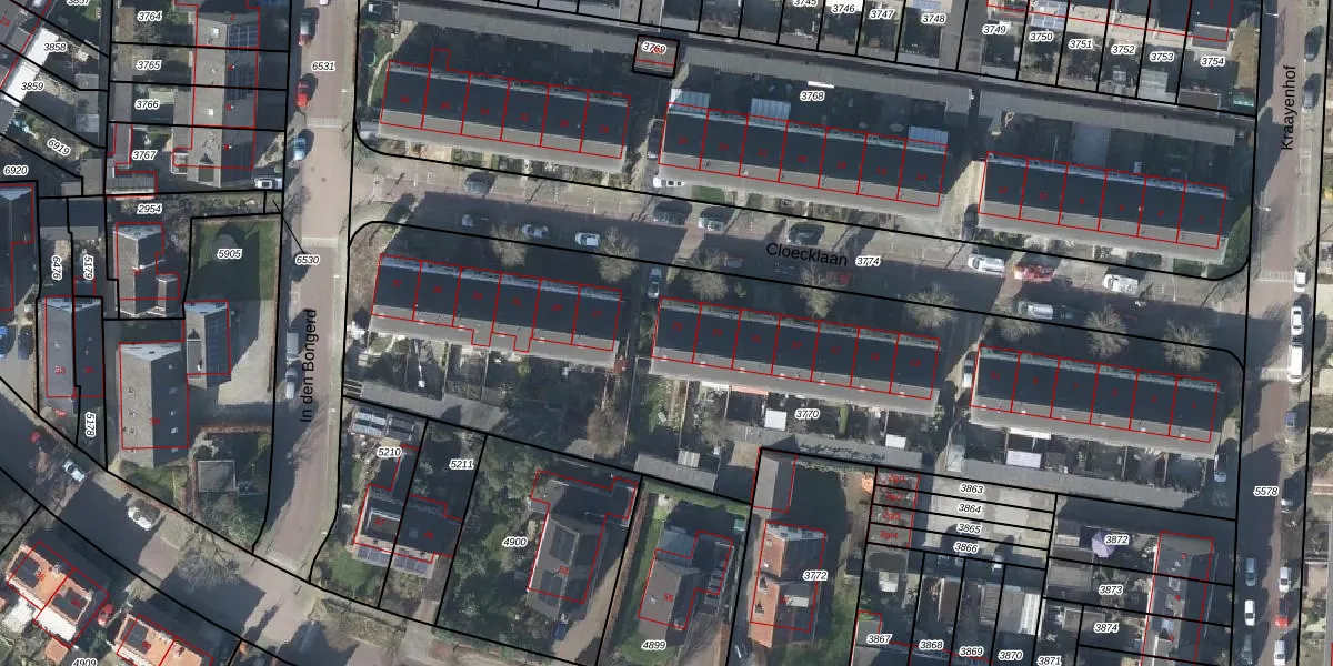 Het perceel waarop Cloecklaan 25 staat heeft een oppervlakte van 3696 m². Dit is een zeer groot perceel. De perceeloppervlakte wordt geregistreerd door het Kadaster. Gedetailleerde informatie over de maten van dit perceel kunt u vinden in het rapport Kadastrale kaart met maatvoering van Cloecklaan 25.
