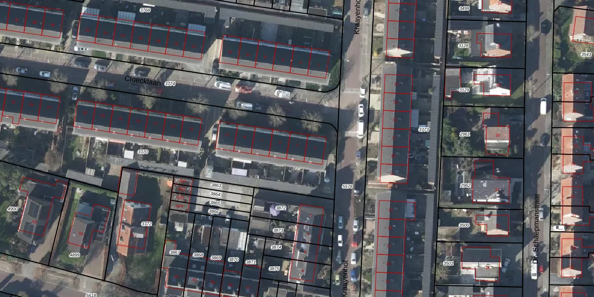 Het perceel waarop Cloecklaan 3 staat heeft een oppervlakte van 3696 m². Dit is een zeer groot perceel. De perceeloppervlakte wordt geregistreerd door het Kadaster. Gedetailleerde informatie over de maten van dit perceel kunt u vinden in het rapport Kadastrale kaart met maatvoering van Cloecklaan 3.