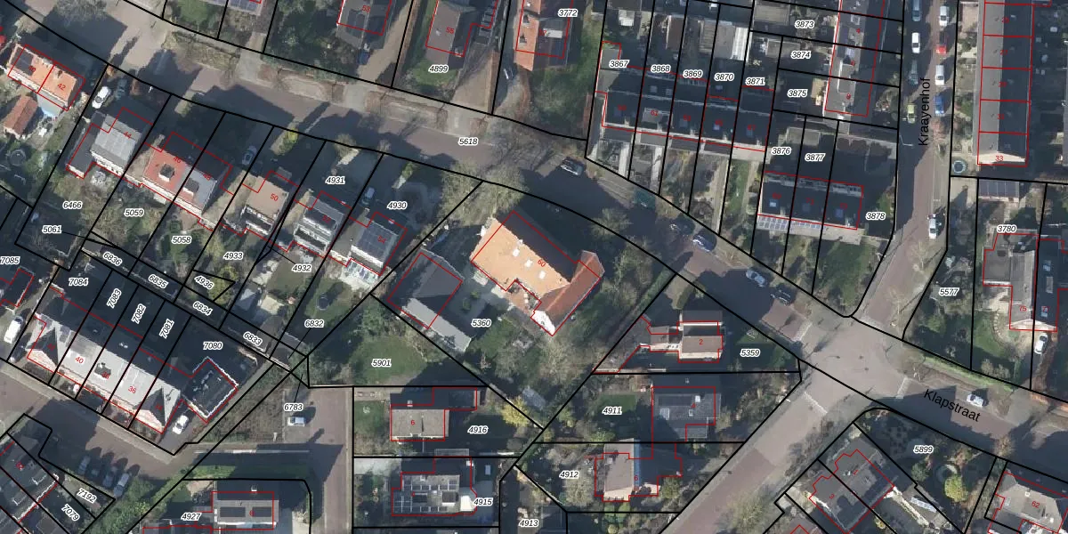 Het perceel waarop Klapstraat 60 staat heeft een oppervlakte van 1430 m². Dit is een zeer groot perceel. De perceeloppervlakte wordt geregistreerd door het Kadaster. Gedetailleerde informatie over de maten van dit perceel kunt u vinden in het rapport Kadastrale kaart met maatvoering van Klapstraat 60.