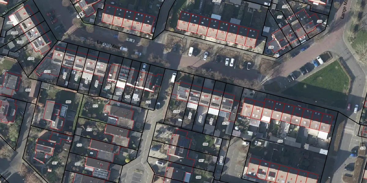 Lange Maat 100 is gelegen op kadastraal perceel WTV00C1706. Deze kadastrale aanduiding is uniek en wordt gebruikt door het Kadaster om eigendomsrechten en andere zakelijke rechten vast te leggen. Het perceel maakt onderdeel uit van de kadastrale gemeente Westervoort.