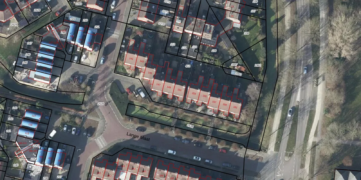 Het perceel waarop Lange Maat 151 staat heeft een oppervlakte van 2255 m². Dit is een zeer groot perceel. De perceeloppervlakte wordt geregistreerd door het Kadaster. Gedetailleerde informatie over de maten van dit perceel kunt u vinden in het rapport Kadastrale kaart met maatvoering van Lange Maat 151.