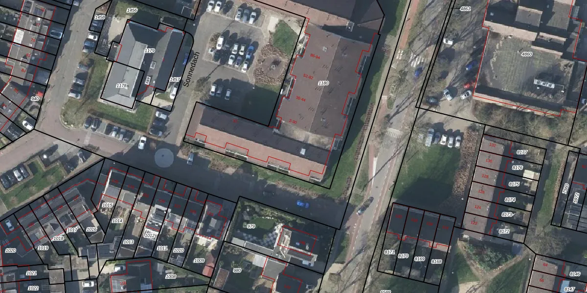 Het perceel waarop Sonnedach 60 staat heeft een oppervlakte van 2550 m². Dit is een zeer groot perceel. De perceeloppervlakte wordt geregistreerd door het Kadaster. Gedetailleerde informatie over de maten van dit perceel kunt u vinden in het rapport Kadastrale kaart met maatvoering van Sonnedach 60.
