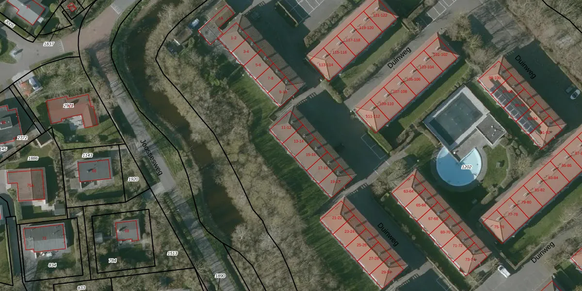 Het perceel waarop Duinweg 13 staat heeft een oppervlakte van 2,5 ha. Dit is een zeer groot perceel. De perceeloppervlakte wordt geregistreerd door het Kadaster. Gedetailleerde informatie over de maten van dit perceel kunt u vinden in het rapport Kadastrale kaart met maatvoering van Duinweg 13.