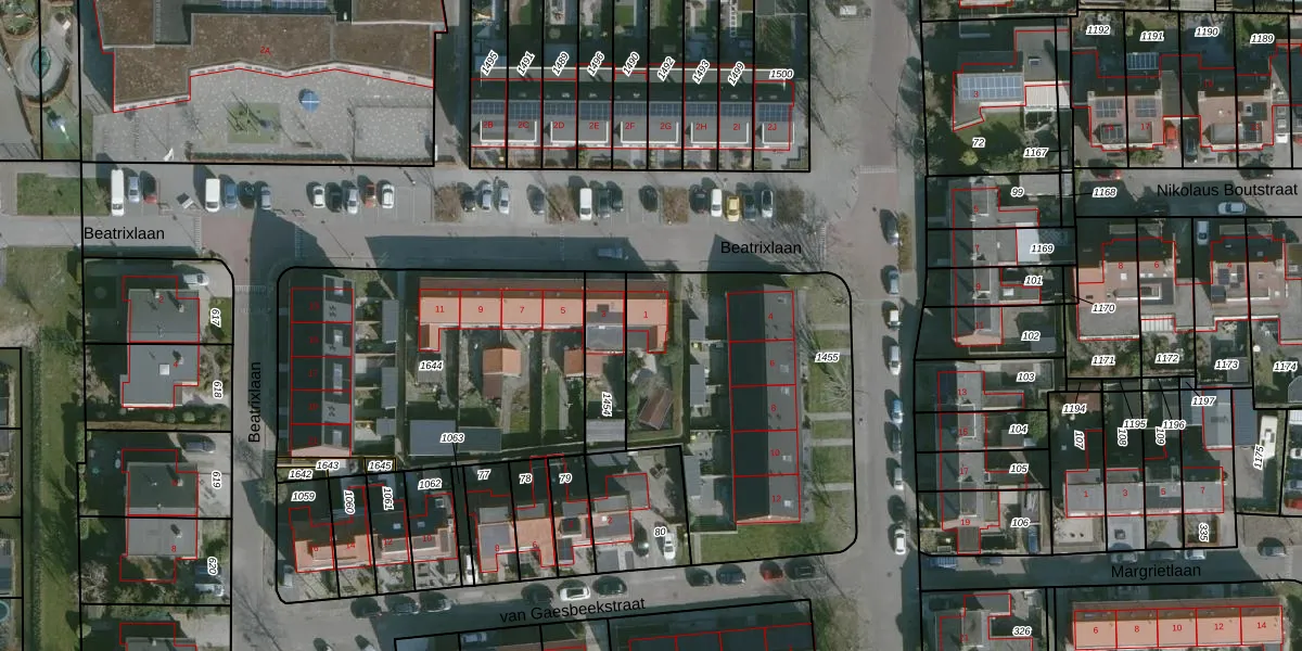 Beatrixlaan 1 is gelegen op kadastraal perceel WMS01C1455. Deze kadastrale aanduiding is uniek en wordt gebruikt door het Kadaster om eigendomsrechten en andere zakelijke rechten vast te leggen. Het perceel maakt onderdeel uit van de kadastrale gemeente Westmaas.