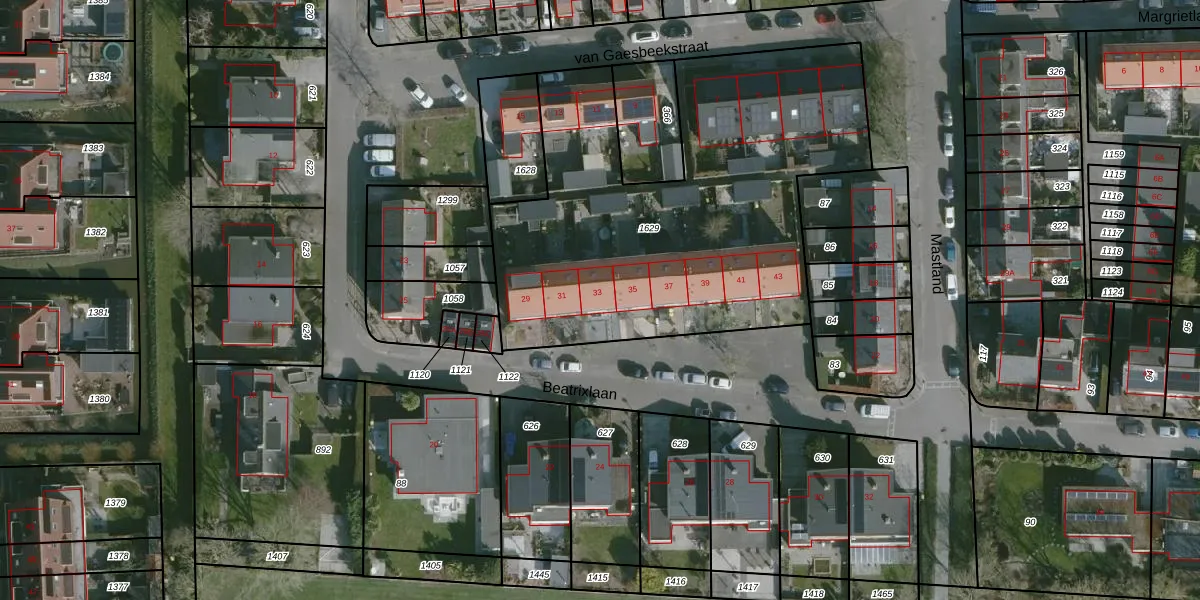 Beatrixlaan 33 is gelegen op kadastraal perceel WMS01C1629. Deze kadastrale aanduiding is uniek en wordt gebruikt door het Kadaster om eigendomsrechten en andere zakelijke rechten vast te leggen. Het perceel maakt onderdeel uit van de kadastrale gemeente Westmaas.