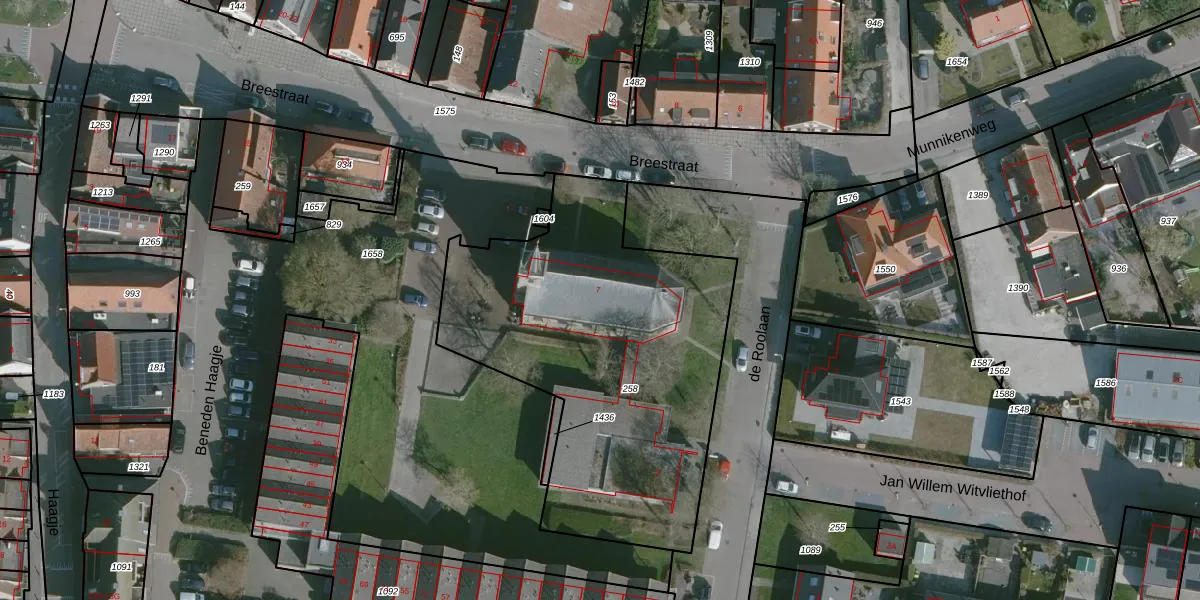 Het perceel waarop Breestraat 7 staat heeft een oppervlakte van 1875 m². Dit is een zeer groot perceel. De perceeloppervlakte wordt geregistreerd door het Kadaster. Gedetailleerde informatie over de maten van dit perceel kunt u vinden in het rapport Kadastrale kaart met maatvoering van Breestraat 7.