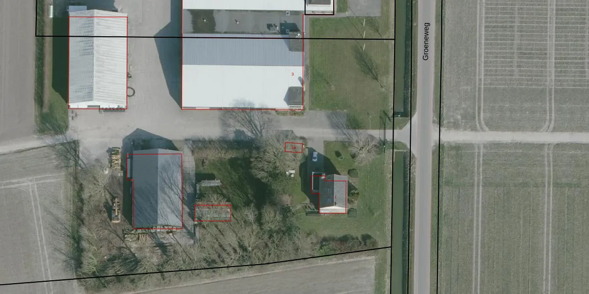 Het perceel waarop Groeneweg 1-A staat heeft een oppervlakte van 19,7 ha. Dit is een zeer groot perceel. De perceeloppervlakte wordt geregistreerd door het Kadaster. Gedetailleerde informatie over de maten van dit perceel kunt u vinden in het rapport Kadastrale kaart met maatvoering van Groeneweg 1-A.