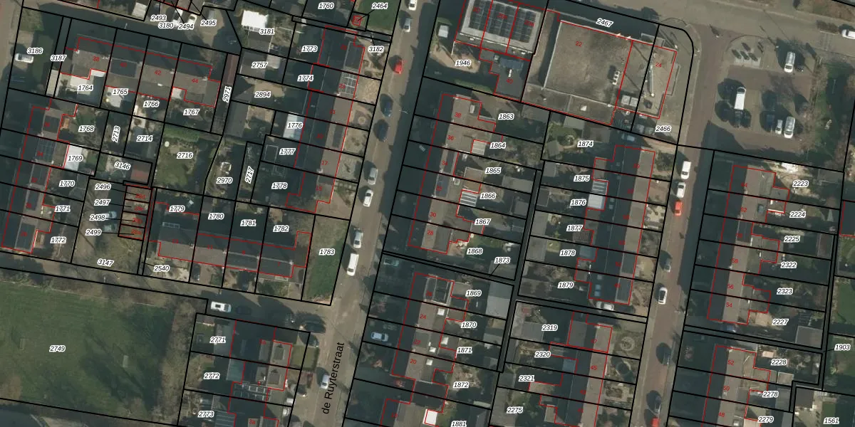 Het perceel waarop de Ruyterstraat 30 staat heeft een oppervlakte van 187 m². Dit is een middelgroot perceel. De perceeloppervlakte wordt geregistreerd door het Kadaster. Gedetailleerde informatie over de maten van dit perceel kunt u vinden in het rapport Kadastrale kaart met maatvoering van de Ruyterstraat 30.