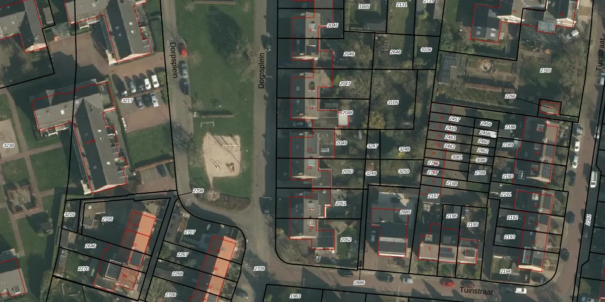 Het perceel waarop Dorpsplein 13 staat heeft een oppervlakte van 296 m². Dit is een middelgroot perceel. De perceeloppervlakte wordt geregistreerd door het Kadaster. Gedetailleerde informatie over de maten van dit perceel kunt u vinden in het rapport Kadastrale kaart met maatvoering van Dorpsplein 13.