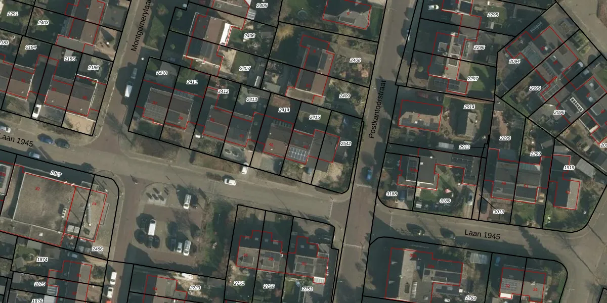Laan 1945 47 is gelegen op kadastraal perceel WEU00B2415. Deze kadastrale aanduiding is uniek en wordt gebruikt door het Kadaster om eigendomsrechten en andere zakelijke rechten vast te leggen. Het perceel maakt onderdeel uit van de kadastrale gemeente Weurt.
