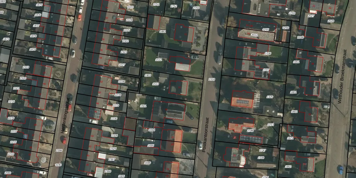 Het perceel waarop Postkantoorstraat 16 staat heeft een oppervlakte van 476 m². Dit is een groot perceel. De perceeloppervlakte wordt geregistreerd door het Kadaster. Gedetailleerde informatie over de maten van dit perceel kunt u vinden in het rapport Kadastrale kaart met maatvoering van Postkantoorstraat 16.
