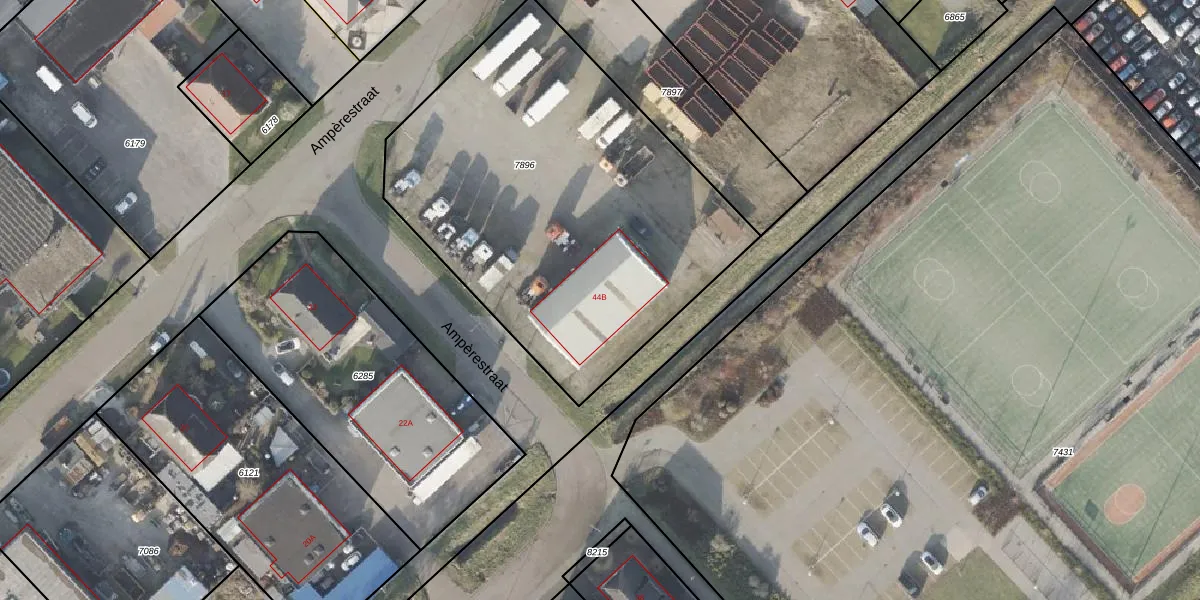 Het perceel waarop Ampèrestraat 44-B staat heeft een oppervlakte van 2244 m². Dit is een zeer groot perceel. De perceeloppervlakte wordt geregistreerd door het Kadaster. Gedetailleerde informatie over de maten van dit perceel kunt u vinden in het rapport Kadastrale kaart met maatvoering van Ampèrestraat 44-B.