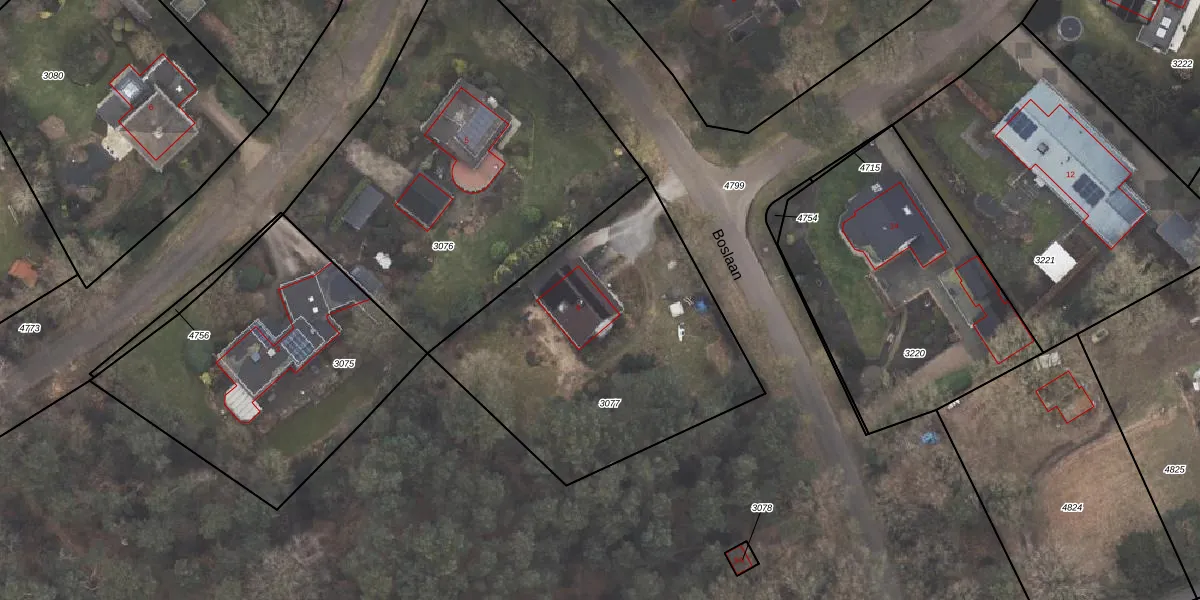 Boslaan 9 is gelegen op kadastraal perceel ODB01F3077. Deze kadastrale aanduiding is uniek en wordt gebruikt door het Kadaster om eigendomsrechten en andere zakelijke rechten vast te leggen. Het perceel maakt onderdeel uit van de kadastrale gemeente Oldebroek.