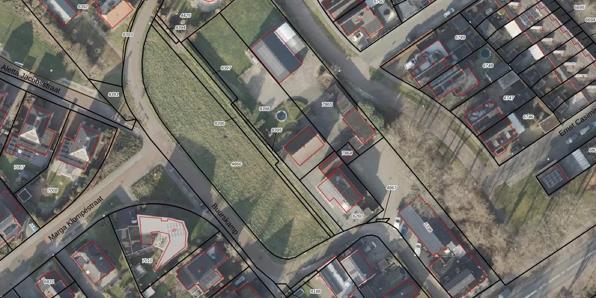 Het perceel waarop Buurskamp 6 staat heeft een oppervlakte van 877 m². Dit is een groot perceel. De perceeloppervlakte wordt geregistreerd door het Kadaster. Gedetailleerde informatie over de maten van dit perceel kunt u vinden in het rapport Kadastrale kaart met maatvoering van Buurskamp 6.