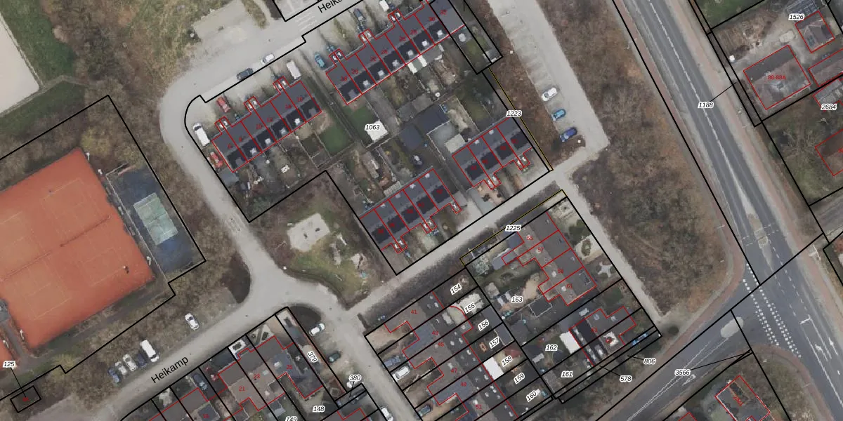 Het perceel waarop Heikamp 40 staat heeft een oppervlakte van 3166 m². Dit is een zeer groot perceel. De perceeloppervlakte wordt geregistreerd door het Kadaster. Gedetailleerde informatie over de maten van dit perceel kunt u vinden in het rapport Kadastrale kaart met maatvoering van Heikamp 40.