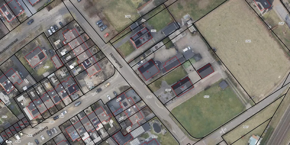 Het perceel waarop Honingweg 18 staat heeft een oppervlakte van 2915 m². Dit is een zeer groot perceel. De perceeloppervlakte wordt geregistreerd door het Kadaster. Gedetailleerde informatie over de maten van dit perceel kunt u vinden in het rapport Kadastrale kaart met maatvoering van Honingweg 18.