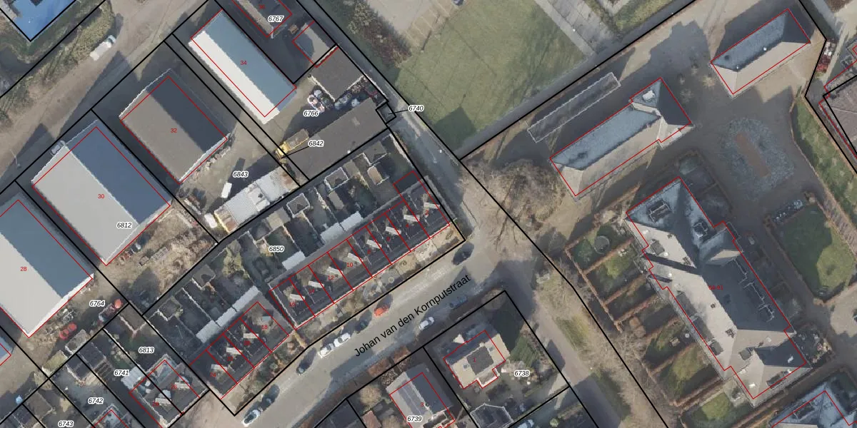 Het perceel waarop Johan van den Kornputstraat 2 staat heeft een oppervlakte van 2241 m². Dit is een zeer groot perceel. De perceeloppervlakte wordt geregistreerd door het Kadaster. Gedetailleerde informatie over de maten van dit perceel kunt u vinden in het rapport Kadastrale kaart met maatvoering van Johan van den Kornputstraat 2.
