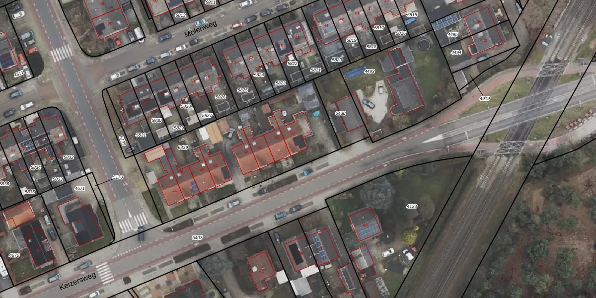 Het perceel waarop Keizersweg 58 staat heeft een oppervlakte van 1636 m². Dit is een zeer groot perceel. De perceeloppervlakte wordt geregistreerd door het Kadaster. Gedetailleerde informatie over de maten van dit perceel kunt u vinden in het rapport Kadastrale kaart met maatvoering van Keizersweg 58.