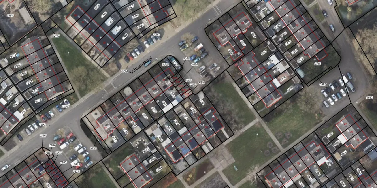 Het perceel waarop Schaapskooi 27-E staat heeft een oppervlakte van 17 m². Dit is een klein perceel. De perceeloppervlakte wordt geregistreerd door het Kadaster. Gedetailleerde informatie over de maten van dit perceel kunt u vinden in het rapport Kadastrale kaart met maatvoering van Schaapskooi 27-E.