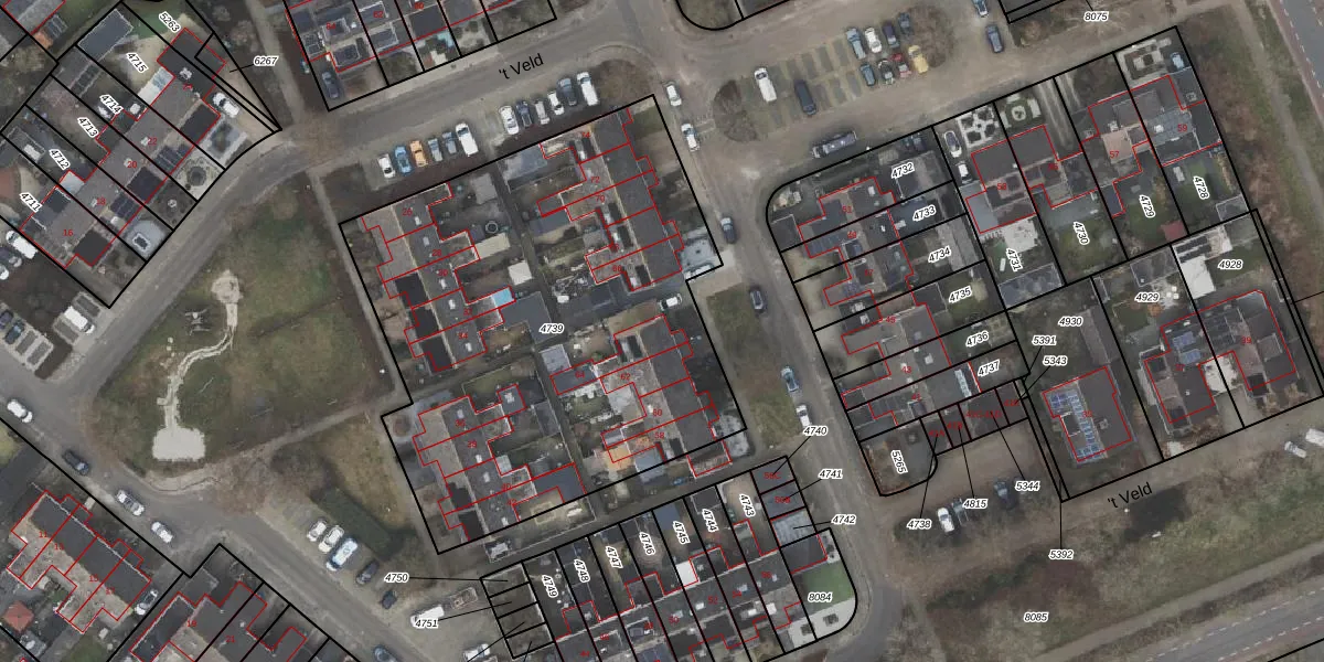 Het perceel waarop 't Veld 64 staat heeft een oppervlakte van 2645 m². Dit is een zeer groot perceel. De perceeloppervlakte wordt geregistreerd door het Kadaster. Gedetailleerde informatie over de maten van dit perceel kunt u vinden in het rapport Kadastrale kaart met maatvoering van 't Veld 64.